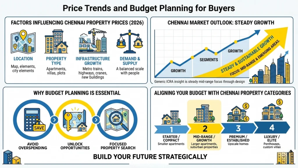 Recent <a href=”https://www.icra.in/Rating/DownloadResearchSummaryReport?id=6726″ target=”_blank”>price data</a> indicates that Chennai’s residential market is showing steady and sustainable growth, especially in mid-range and emerging areas. This makes it important for buyers to align their budget with the right category of property.